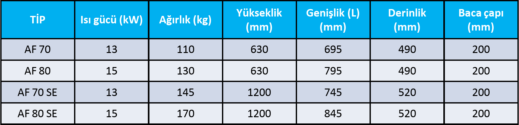 TİP | Isı Gücü (kW) | Ağırlık (kg) | Yükseklik (mm) | Genişlik (L) (mm) | Derinlik (mm) | Baca Çapı (mm) |