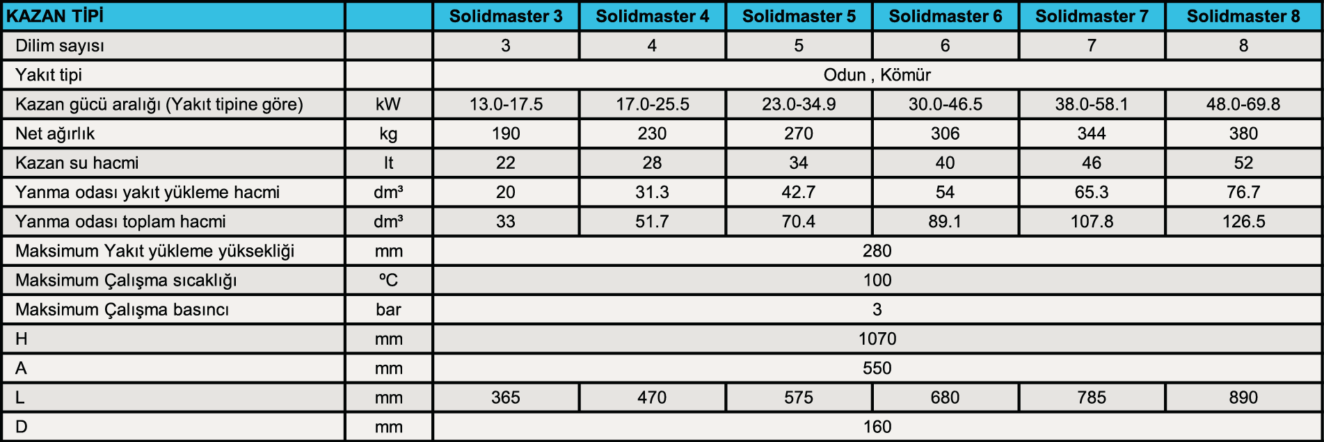 Solidmaster - Katı Yakıt Kazanı - Teknik Özellik Tablosu
